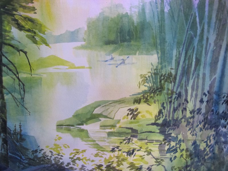 watercolour, 22″ x 30″ This location does not actually exist. It is based on many happy memories of time spent on beautiful Lake of the Woods. I named it Eagle Bay because the rock formation at the bottom right resembles an eagle.