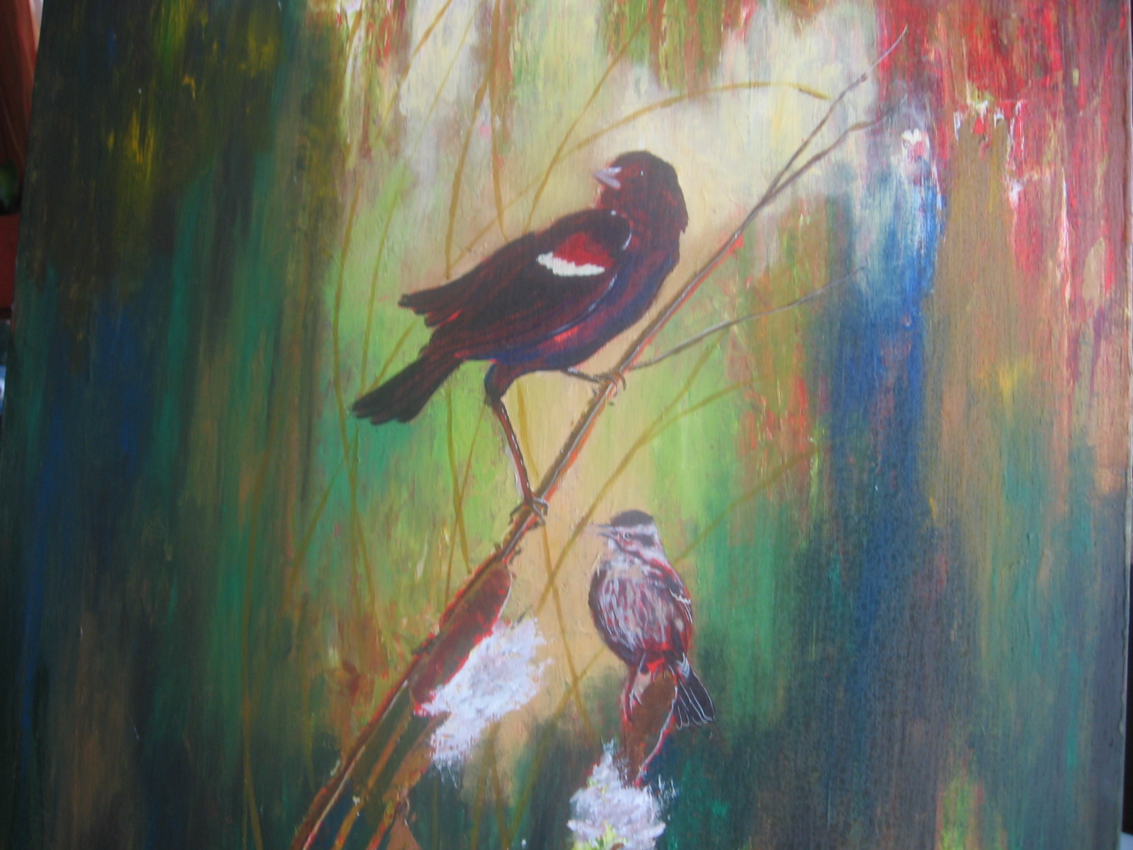 Red Wings Acrylic, 24″ x 24″. This piece was part of an outdoor art exhibit. Male red-winged blackbirds are frequently seen in the reeds along Laurenson Creek in Kenora. Females are less often visible but I decided to give her equal billing. Price: SOLD
