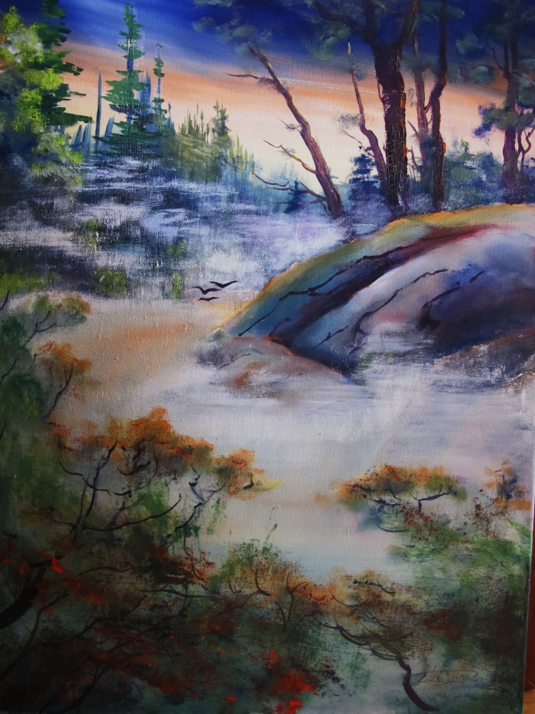 Acrylic, 6″x8″. I was sketching at the Blindfold Lake Dam when I saw this fisherman, totally at peace with the warmth, the sunlight and the beauty of the place. When I got back to the studio, I tried to capture that feeling rather than a realistic portrayal of a fisherman.